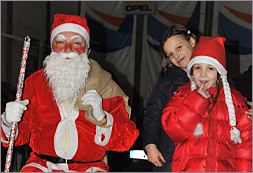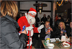 Patrick Graeffly und Martin Metzler hatten die mobile Küche schnell auf Touren, so dass der Glühwein im Hinblick auf Temperaturen um 5 Grad um so beliebter war. Doch die Anspannung bei den Kindern stieg zunehmend, da diese auf den Weihnachtsmann warteten, der dann pünktlich gegen 18.30 Uhr die Halle besuchte. Bei Weihnachtsliedern – begleitet an der Orgel von Olga Bruch – stieg die Stimmung so richtig.