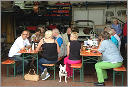 Wie viele Opel die Sammlung beinhaltet, weiß Herr Degener nicht, „ich habe sie noch nie gezählt“. Zwischenzeitlich kauft er sämtliche Opelfahrzeuge aus ganz Europa zusammen. Zum Kaffeetrinken haben wir in der Werkstatt Platz genommen, in der sich gerade 6 Fahrzeuge in der Restauration befinden.