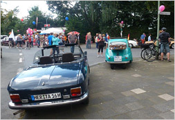 Zum „1. Tag der Trinkhalle“ am 20.08.2016 beschlossen die Herner Oldies sich nach Wanne-Eickel zu „Elke´s Bude“ zu begeben, die ruhrgebietsweit zu den 50 ausgewählten Buden gehörte. Dort war für 16.00 Uhr ein literarisches und musikalisches Programm vorgesehen. Wir hatten uns entschlossen, dort mit mehreren Fahrzeugen vorzufahren. Teilnehmer waren: Das Team Metzler, Frank Meier und Britta, Michael Posser, Frank Michalak, Frank Brohm, Peter und Elke Seitz, das Team Born. Unser Auftritt führte dazu, dass fast die gesamte Kreuzung verstopft war, da zeitgleich ca. 60 Fahrradfahrer vor Ort eintrafen. Die ganze Veranstaltung war etwas wuselig, man merkte, dass die Budeninhaberin mit dem Auflauf doch so nicht gerechnet hatte. Nach einem kurzen Interview mit „Hallo Herne“ begaben wir uns von dort aus weiter zur Alten Drogerie Meinken. Wir konnten unsere Fahrzeuge in Sichtweite des Cranger Tores aufstellen, worüber die dort anwesenden Zuschauer sehr begeistert waren. Ein kurzer Umtrunk in der Drogerie wurde uns vom Inhaber angeboten. Nachdem wir auf dem Hof noch der Musik der „Los Gerlachos“ zuhörten, konnte der Nachmittag für uns beendet werden.