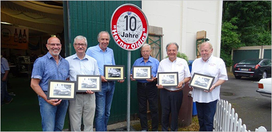 Peter Seitz und Hilmar Born hatten eine Bilderpinnwand aufgebaut, die einen Rückblick der letzten 10 Jahre zeigte, Martin Metzler hatte einen in Herne ansässigen Bierbrauer bestellt, der lokales Bier vorstellte, Leander Bruch hatte auf seiner Gitarre 2 Lieder vorbereitet und Wolfgang Bruch einen passenden Jubiläumsvortrag. Dieser erschöpfte sich nicht nur mit dem Rückblick der letzten 10 Jahre, sondern er berichtete auch über das gesamte Fahrzeuggeschehen in Herne seitdem hier Fahrzeuge zu verzeichnen waren. Es schloss sich natürlich eine Ehrung der Gründungsmitglieder an, namentlich Martin Metzler jun., Martin Metzler sen., Patrick Graeffly, Barry Tennant und Rüdiger Achtruth. Sie alle und der Eigentümer der Halle, Heinrich Beestermöller, erhielten ein passendes Geschenk.