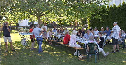Der Winzer Herr Marmann war bereits bestens vorbereitet: Er hatte auf einer großen Mischobstwiese Tische und Bänke aufgestellt, so dass wir bei den wunderbaren Temperaturen die Weinprobe (gemäßigt!) im Freien durchführen konnten. Gegen 20.00 Uhr waren wir wieder im Hotel, nachdem wir unsere Fahrzeuge ordnungsgemäß auf einem separaten Parkplatz abgestellt hatten. Das Abendmenü, welches die Hotelleitung vorbereitet hatte, war einfach spitze, mit der Folge, dass wir noch lang an dem wunderbaren und warmen Abend draußen den Tag haben ausklingen lassen.