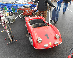 Eine weitere Halle ist komplett bestückt mit örtlichen Clubs. Diese hatten sehr schöne Stände aufgebaut, jeweils aufgegliedert nach Themen und Fahrzeugschwerpunkten. Eine weitere Halle beinhaltete jegliches Zubehör, Plakate, Mode und Schilder. Wie bei jeder französischen Veranstaltung war die Gastronomie im Außenbereich hervorragend bestückt, es gab einen extra Champagnerstand, Spezialitäten aus großen Pfannen, Bierstand, etc. Leider bildeten sich hier in der Mittagszeit ganz erhebliche Schlangen, so dass man doch etwas Geduld brauchte. Gegen Mittag waren wir so ermüdet, dass wir uns entschlossen, vom Veranstaltungsgelände herunterzugehen und nochmals den Oldtimerparkplatz zu besichtigen.