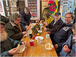 Es schlossen sich angenehme Benzingespräche an, wobei auch Teilnehmer aus dem gesamten Oldtimerumfeld erschienen waren, u.a. Jens Patros, Vorsitzender der Wittener Oldtimerfreunde, Burkhard Welzel, Vorsitzender des ACE Herne und viele andere mehr. Patrick Graeffly und Martin Metzler hatten wie immer die Kochecke bestens im Griff, so gab es leckere Erbsensuppe mit Einlage und eine richtig gute Gulaschsuppe. Leider war der Glühwein bereits um 20.00 Uhr ausverkauft, so dass wir uns mit den übrigen Getränken befassen mussten. Gegen 22.00 Uhr löste sich die Geselligkeit allmählich auf, weil doch am nächsten Tag noch viele ihrer beruflichen Tätigkeit nachgehen mussten.