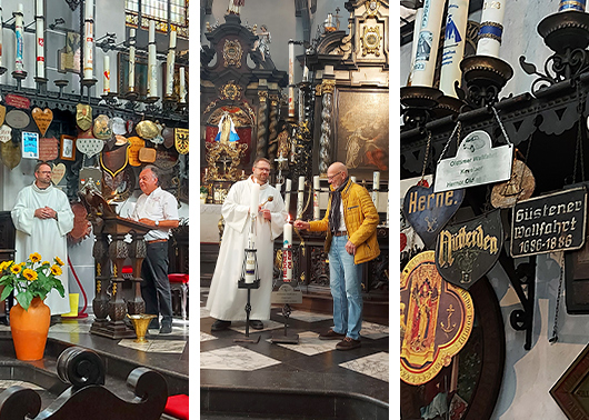 Nach einer Fahrzeit von ca. 1,5 Stunden erreichten wir unser Fahrziel. Es waren auf dem kirchlichen Parkplatz Parkbuchten für uns reserviert. Von dort aus gingen wir in einer Prozession, angeführt von Uli Eickhoff mit einer großen Kerze und Hilmar Born mit dem Wallfahrtsschild in die Kapelle. Dort erwartete uns bereits der Pfarrer.