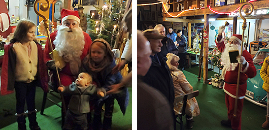 Pünktlich gegen 19.00 Uhr erschien der Nikolaus in seinem Himmelsgefährt: Ein Mercedes-Benz 170 D, Baujahr 1952, in rostrot, festlich geschmückt und chauffiert von Frank Brom. Die Kinder hatten ihre helle Freude, sie hatten dem Nikolaus sogar etwas mitgebracht.