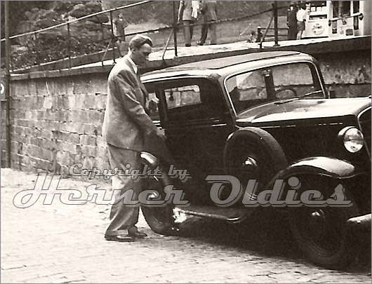 Ein Vorkriegsauto im täglichen Einsatz nach dem II. Weltkrieg zeigt dieses Foto. Es handelt sich um einen Opel P 4 in der Spezial-Variante (zu erkennen an dem Erstzrad auf dem rechten Kotflügel). Das Bild entstand 1946 auf einer Fahrt ins Sauerland (vermutlich zur Dechenhöhle). Es entstammt der Sammlung von Wolfgang Bruch.