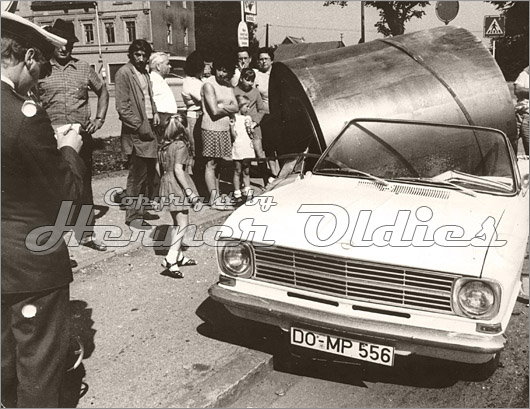 Opfer eines skurilen Verkehrsunfalls war dieser Opel Kadett B im Jahre 1967 in Dortmund. Ein Coil hatte sich von einem Transportfahrzeug gelöst und war auf den nagelneuen PKW geprallt. Das Foto stammt von unserem Oldtimerfreund Adolf Vogel aus Dortmund.