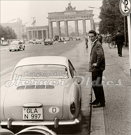 Ein geradezu historisches Foto hat uns Oldtimerfreund Wolfgang Luft aus Bochum zur Verfügung gestellt. In dem Karmann Ghia eines Freundes aus Gladbeck gelang ihm die Flucht im Jahre 1961 in den damaligen Westteil Berlins. Das Foto ist unmittelbar vor dem Brandenburger Tor aufgenommen worden.