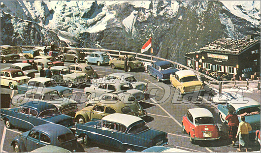 Ein weiterer Schnappschuss vom Parkplatz EDELWEISS/GROSSGLOCKNER aus den 50iger Jahren. Bemerkenswert die große Anzahl von Opel Fahrzeugen.