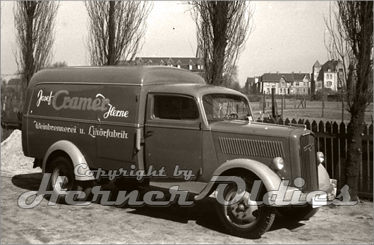 Einen Opel Blitz (mit Sonderaufbau) zeigt dieses Bild aus den 50iger Jahren in Herne. Die Firma Cramer hatte eine Gaststätte in Herne-Sodingen und eine eigene Brennerei. Das schöne Bild wurde uns von Herrn Ludger Wickenbrock zur Verfügung gestellt.