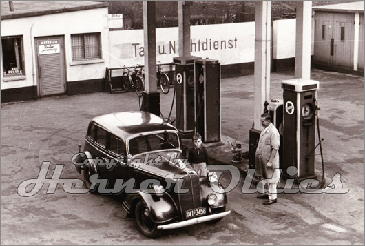 Dieses Foto zeigt einen Opel Super 6. Es wurde im Jahre 1955 auf einem Tankstellenhinterhof an der Bahnhofstraße in Herne aufgenommen. Obwohl das Fahrzeug aus der Vorkriegszeit stammt, wurde es auch in den fünfziger Jahren aufgrund seiner Zuverlässigkeit weitergefahren. Das Bild stammt aus dem Bildarchiv der Stadt Herne.