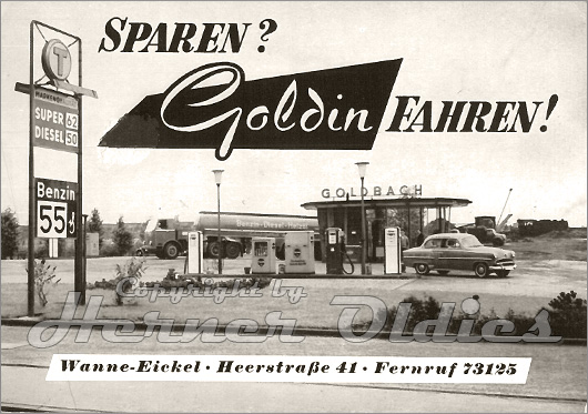 Erinnerung an die Firma Goldin werden wach bei Vorlage dieser Postkarte, die vermutlich aus dem Jahre 1972 stammt. Das abgebildete Tankstellengelände gibt es noch heute auf der Heerstraße in Herne, allerdings befindet sich dort eine neuzeitliche Tankstelle. Im Hintergrund waren damals die Tanklager.