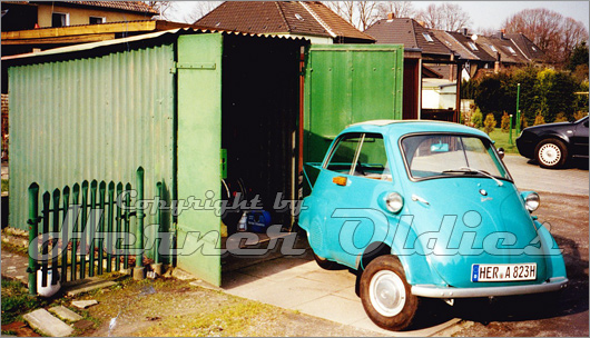 Diese Isetta, die sich im Eigentum von unserem Hallenmitglied Martin Metzler befindet, wurde an ihrem original Garagenplatz in Herne-Sodungen im Jahre 2000 aufgefunden. Der damalige Eigentümer hatte in den fünfziger Jahren eine Wellblechgarage extra passend für die Isetta gebaut.
