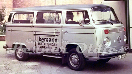 Dieser VW T2 (als Bulli bekannt) wurde auch von der Firma Ikemann als Bestattungsfahrzeug benutzt. Das Bild entstammt dem Jahre 1969.