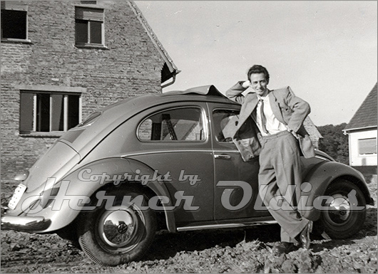 Stolz präsentiert dieser Autobesitzer seinen VW Käfer Ovali mit Faltdach im Jahre 1956 vor dem Rohbau des neuen Eigenheimes.